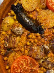 Lo primero que haremos será freír unos ajos, sin quitarle la piel, para darle un poquito de sabor al aceite en el que vamos a pasar tanto las verduras del cocido como la carne del mismo. Añadiremos las verduras con los garbanzos escurridos, la patata, la zanahoria que estará cortada en rodajas y añadiremos también cualquier otra verdura que hayamos echado al cocido. Una vez hayamos marcado un poco las verduras en la sartén haremos lo mismo con la carne que hayamos usado; panceta, morcilla etc.… Las cortaremos en rodajas entera, a nuestro gusto, y la pasaremos también por la sartén qué hemos usado antes. Una vez hecho esto lo colocaremos en una olla de barro plana que sería la ideal para hacerlo, si no tenemos tendríamos que usar cualquier otro tipo de olla que sea plana no muy profunda como una paella, suficiente para la cantidad de gente que vayamos a comer. Una vez reservado lo que hemos frito anteriormente, haremos un sofrito y cuando tengamos hecho el sofrito le añadiremos 50 gramos de arroz por cada persona que vaya a comer y lo removeremos con el sofrito para que coja sabor.