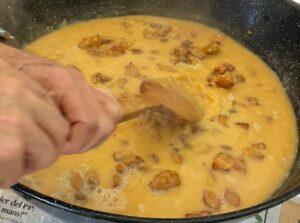 6- Sin dejar de remover añadimos el majado del mortero, con un poco de agua acabamos de sacar los que nos haya quedado en el mortero y lo añadimos.
