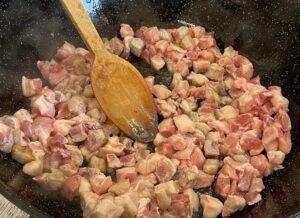 4- Tras sacar los ajos echamos la panceta troceada, ponemos un poco de sal, (recordar que en el mortero hemos puesto sal y que el chorizo también lleva sal), freímos hasta que esté bien dorada, y, seguidamente incorporamos el chorizo también troceado.