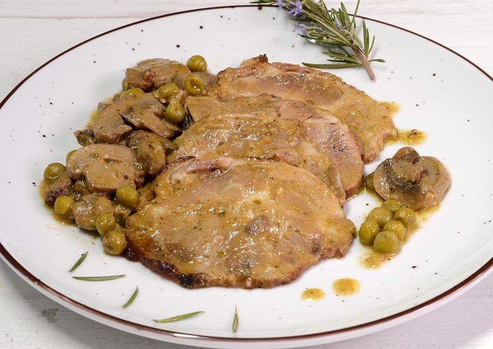 Una receta sabrosa. La tierna carne de cabeza de lomo se complementa perfectamente con nuestra salsa espaƱola acompaƱada de champiƱones y guisantes.